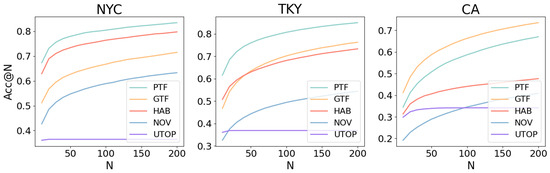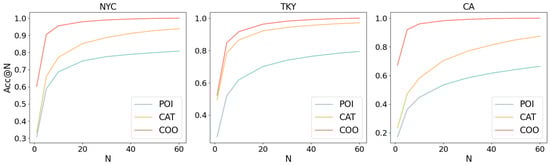 Figure 8 shows the accuracy of the top-N prediction results for each module. It can be seen that as N increases, the prediction accuracy in the three datasets initially experiences a rapid improvement, followed by a gradual slowdown in the rate of improvement, maintaining a relatively slower upward trend. PSLM4ST should consider both the accuracy of the top-N predictions and the prompt length constraints to select an appropriate N value. For example, we set N to 60. Additionally, it can be seen that compared to the results of the NYC and TKY datasets, the GTF module achieves the highest accuracy in the CA dataset, while other modules related to specific users exhibit lower performance. The CA dataset has the fewest average check-ins, which means that the model finds it more challenging to capture preferences related to specific users. However, relatively richer global check-in data can support the GTF module in achieving relatively better performance. The UTOP module only mechanically responds to users’ habits. It can be seen that its prediction accuracy is almost stable. After N = 10, the accuracy barely improves, so only the first 10 items in each time slot on the schedule need to be used.