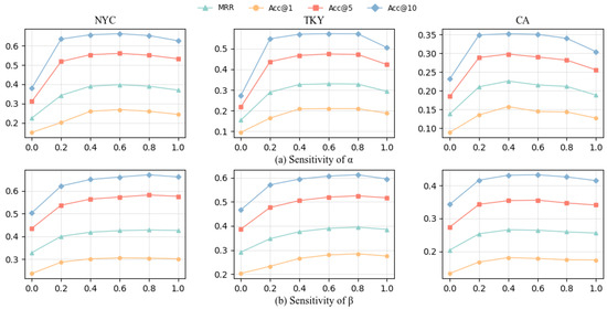 Regarding the limitations of our model, the approach employing empirical hyperparameters, such as the balance coefficients between multiple preference modules and the granularity of time-slot division, is a common practice in related studies [5,34,35]. However, this approach often necessitates targeted adjustments for different datasets, thus significantly increasing the complexity of model debugging and the overall cost of the application. Consequently, it is imperative to explore adaptive mechanisms in future work that can enable models to automatically adapt to the characteristics of diverse datasets, thereby mitigating the reliance on empirical parameter tuning. In addition, we plan to integrate more multimodal data sources, including text reviews, images, videos posted by users on social platforms, users’ social relationships, and detailed POI descriptions. By extracting relevant features from these multimodal data sources, we can enrich the POI information and achieve a more comprehensive understanding of users’ needs and preferences.