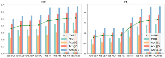 It is worth noting that, from the variations in suboptimal models across different datasets, recent research competition in the field of POI recommendation has been quite intense. For instance, on the NYC dataset, MTNet and ROTAN—both of which focus on temporal awareness—achieved suboptimal results on different metrics. This indicates that users in the NYC dataset exhibit more regular temporal patterns, and the optimal-performing PSLM4ST is capable of effectively capturing the time slot preferences. On the TKY dataset, STHGCN, based on hypergraph Transformers, achieved suboptimal results, while MTNet and ROTAN performed relatively worse. This might be due to the fact that users in the TKY dataset had relatively richer check-in trajectories, and both STHGCN and PSLM4ST demonstrated strong capabilities in capturing global collaborative signals. Although ROTAN also considers point-of-interest transition relationships, it only incorporates them as pre-trained embeddings, and subsequent extensive learning through sequence models does not lead to significant final performance. On the final CA dataset, PSLM4ST and ROTAN engaged in intense competition. Similar to the situation in the NYC dataset, PSLM4ST performed relatively better in the Acc@5 and Acc@10 metrics. This suggests that PSLM4ST possesses strong generalization capabilities when expanding the prediction scope, enabling it to cover correct results more comprehensively.