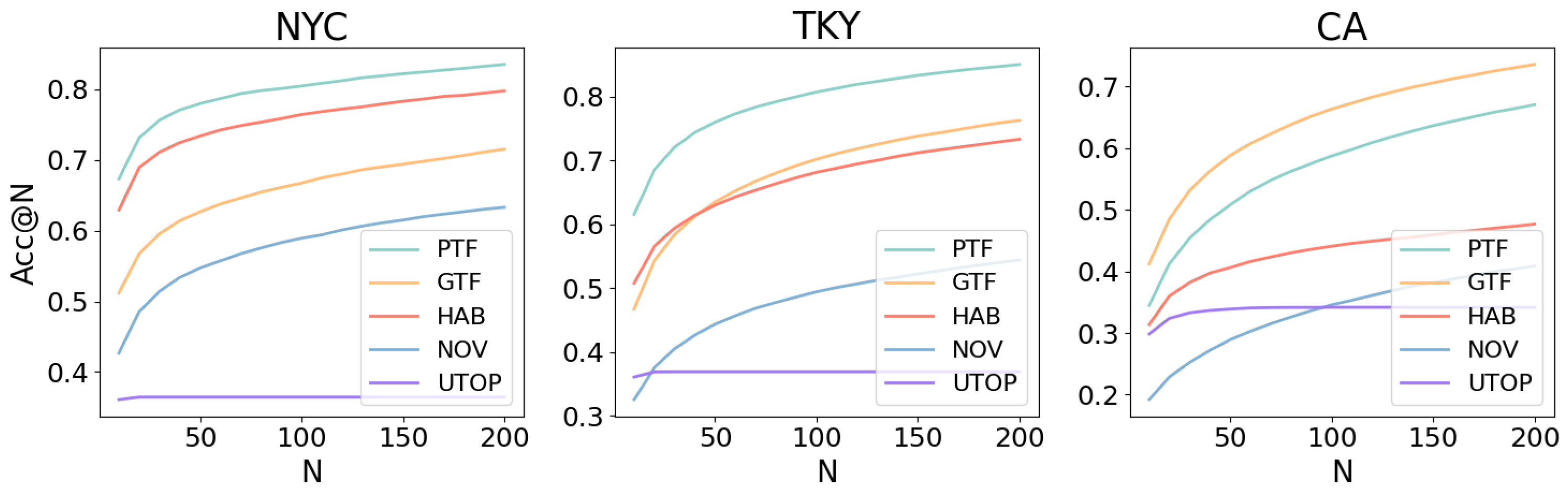 To evaluate the impact of weight balance within the preference modules, we conducted a sensitivity analysis on the hyperparameters and for specific preference modules on three datasets. As shown in Figure 10, performance trends exhibit an initial increase followed by a decrease as hyperparameters increase across all three datasets. For instance, setting to 0 causes the model to consider only the user’s novelty preference, while setting to 1 makes the model consider only the user’s habit preference. And setting to 0 causes the model to consider only the user’s personal POI transfer preference, while setting to 1 makes the model consider only the user’s global POI transfer preference. In both extreme cases, performance is lower than when both preferences are considered simultaneously. This shows that users are affected by multiple preferences, and different preference modules can generate different effective candidate sets.