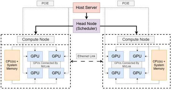 Cluster computing has undergone significant evolution over the past few decades. The initial drive for greater computational throughput gave rise to CPU clusters composed of a small number of high-performance cores []. However, as machine learning and deep learning (DL) workloads surged, GPUs have become an indispensable element of modern infrastructure. Large-scale GPU clusters—once the domain of specialized scientific centers—are now commonplace in academic, industrial, and cloud environments [,,]. These systems comprise interconnected nodes, each hosting one or more GPUs, and often feature heterogeneous hardware configurations that integrate diverse CPU architectures, memory hierarchies, and GPU generations [,,,]. To support the high data rates demanded by ML/DL workloads, GPU clusters employ high-speed interconnects—such as PCIe, NVLink, and InfiniBand—to facilitate rapid data exchange both within and across nodes [,]. Figure 1 depicts a representative GPU cluster architecture.