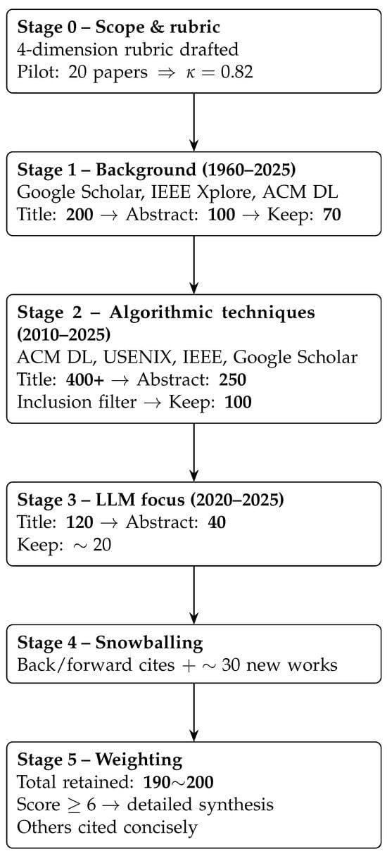 Stage 2: algorithmic techniques (2010–2025). Databases searched: ACM DL, USENIX, IEEE Xplore, Google Scholar. Canonical query: