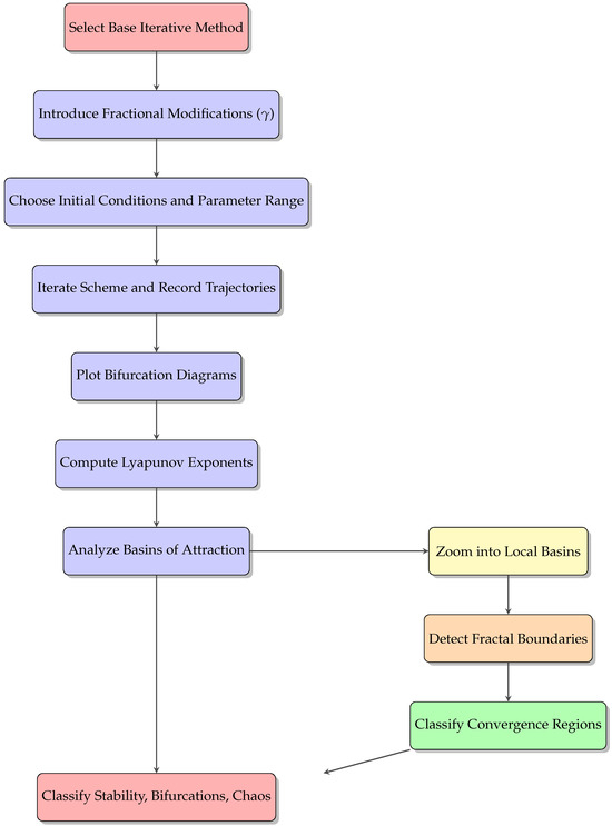 To investigate the emergence of chaos in fractional-order iterative models, we adopt a general computational framework (see the flowchart in Figure 1). This approach involves selecting a base iterative method, introducing fractional-order modifications, systematically varying key parameters, computing the resulting Lyapunov spectra and bifurcation diagrams, and analyzing the associated stability regimes. To study bifurcation and chaos in the context of fractional-order schemes, we consider the nonlinear function