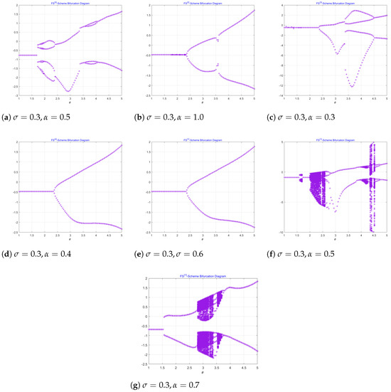 This function serves as a representative case for exploring the dynamical behavior of iterative processes, particularly under the influence of the damping parameter , as discussed in [24,25]. When the parameter is varied within the fractional iterative method, the system exhibits significant changes in behavior. As crosses certain critical values, the system transitions through different dynamical regimes—namely, stability, bifurcation, and chaos. These transitions are summarized in Table 1. Figure 2a–g present the corresponding bifurcation diagrams, where the y-axis indicates the steady-state or long-term values of the system variable and the x-axis represents values of the parameters and . These diagrams illustrate how the nature of the solution—whether a fixed point, a periodic orbit, or a chaotic trajectory—evolves as the parameters change.