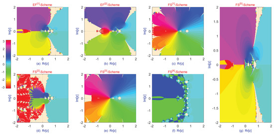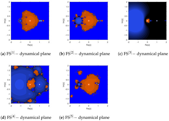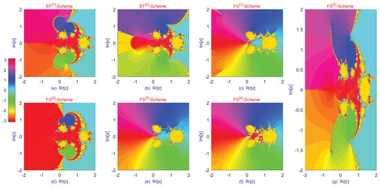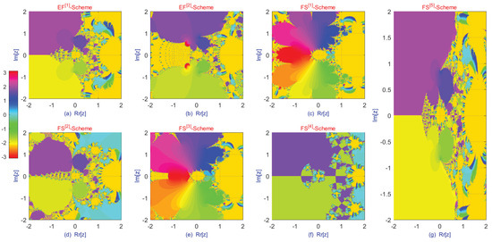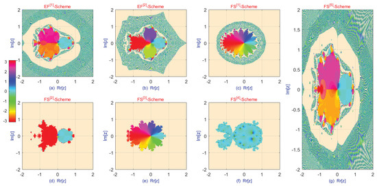 In addition to conventional analyses based on spectral radius or contraction mappings, the study of dynamical planes offers further insights into the stability properties of fractional-order iteration schemes. A dynamical plane is a graphical representation in which each point in the complex (or real) plane corresponds to an initial guess, and its color indicates the behavior of the iteration—specifically, whether it converges to a root (or attractor) or diverges [26,27,28]. In fractional-order schemes, the memory effect governed by the fractional order , along with any introduced chaotic perturbations, significantly influences the structure of these planes. For stable schemes, the dynamical plane typically exhibits wide, smooth, and well-separated basins of attraction associated with different roots or solutions, reflecting robustness to initial guesses. The boundaries between these basins are often fractal, indicating sensitivity to initial conditions. Lowering the fractional order tends to smooth these fractal boundaries, thereby reducing sensitivity and enlarging regions of stable convergence. Properly tuned chaotic components can help prevent the iteration from becoming trapped in non-optimal attractors; however, excessive chaos may distort the basin structure, leading to fragmented or discontinuous convergence regions and signaling instability.
