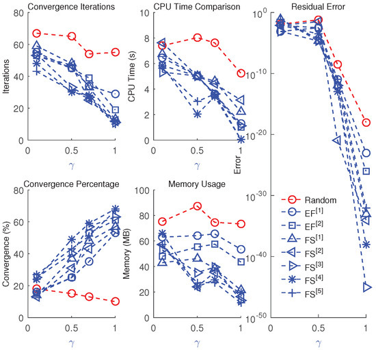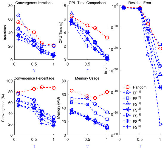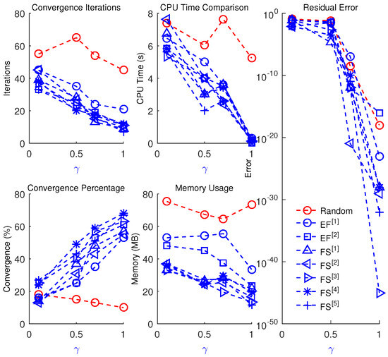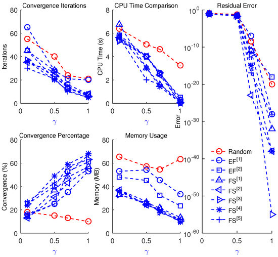 The developed schemes ( –) consistently outperform existing fractional-order methods ( –) in terms of residual error reduction, faster convergence, higher percentage of convergence, lower memory usage, reduced computational time, and improved robustness across a range of fractional parameters (see Table 3, Table 4, Table 5, Table 6, Table 7, Table 8, Table 9, Table 10, Table 11, Table 12, Table 13, Table 14, Table 15, Table 16, Table 17, Table 18, Table 19, Table 20 and Table 21 and Figure 6 and Figure 7). The results indicate that as approaches 1, convergence improves significantly, and the use of chaotic analysis facilitates optimal parameter tuning.