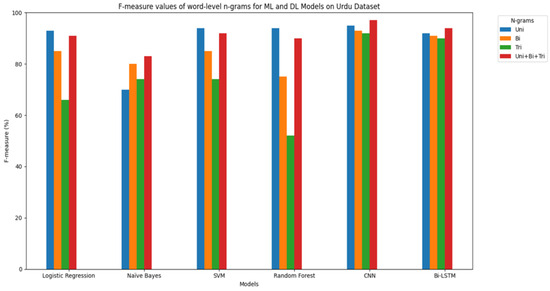 The bar chart of F-measure values for different word-level n-grams (uni-, bi-, and tri-gram alone or their combined uni + bi + tri) based on machine learning (ML) and deep learning (DL) models employed for the offensive language detection on the dataset of Urdu language is shown in
