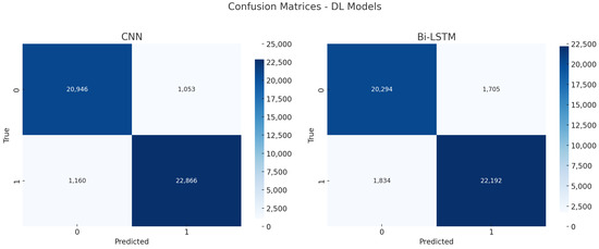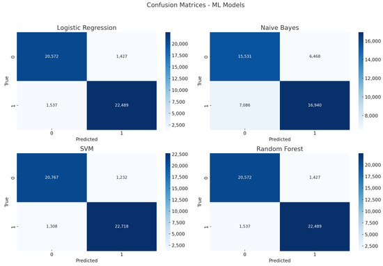 Figure 5). These matrices demonstrate the benefits and drawbacks of using ML, DL, and LLM-based classifiers. The SVM and Logistic Regression ML models provide high true-positive and true-negative counts, along with balanced sensitivity and specificity. Conversely, Naïve Bayes had more false positives and false negatives, consistent with its lower performance metrics.