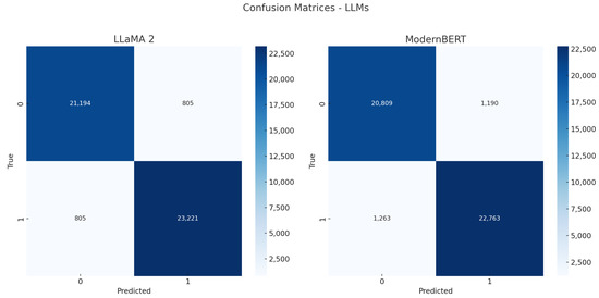 The classification was almost symmetric, suggesting that LLaMA 2 was particularly the best among LLMs with high precision and was least confused between classes. ModernBERT, achieving slightly lower accuracy but high false-negative rates and low overall error, still performed well. These results validate that, particularly for fine-tuned LLMs on task-specific datasets, the model is able to capture the nuanced semantics of Roman Urdu–English code-mixed content.