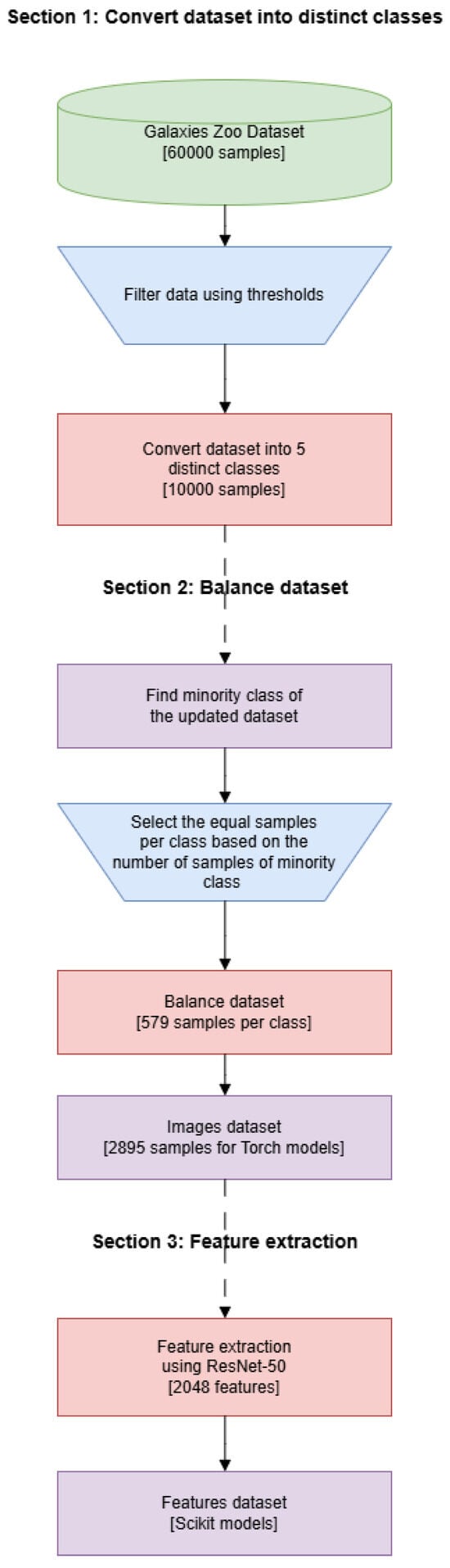 The initial stage of the experiment involved dataset preparation, specifically targeting the Galaxies Zoo dataset [53]. Prior to training, dataset refinement was necessary to transform continuous target variables into discrete labels. Threshold comparisons facilitated this transformation, resulting in the delineation of five distinct classes.