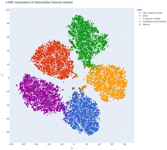 t-SNE projection of the 2048-D ResNet-50 feature space for the balanced Galaxy Zoo subset. Points are colored by morphology: completely round smooth (green), in-between smooth (orange), cigar-shaped smooth (red), edge-on disk (purple), and spiral (blue). The well-separated clusters confirm the discriminative power of the extracted features.
