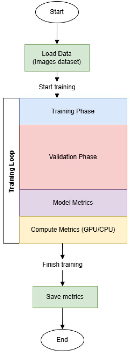 For models developed in PyTorch v2.6.0, training loops incorporated metric collection directly. Thus, both computational and model performance metrics were continuously captured and evaluated within each training on 25 epochs. Although this embedded approach streamlined monitoring, it introduced minor computational overhead, slightly affecting overall training duration. Nonetheless, it allowed for more precise tracking of model dynamics throughout training epochs.