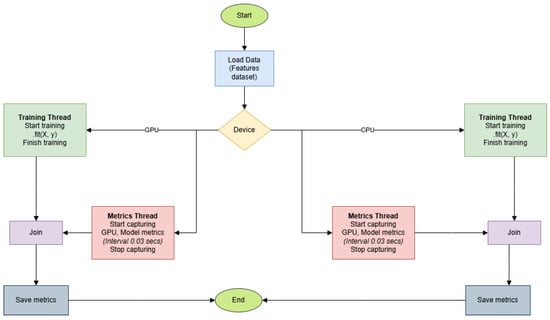 In Figure 3, a sequential workflow focusing on image datasets is illustrated, featuring a loop-based approach with training, validation, and subsequent resource-usage evaluation. Final storage of computed metrics was executed upon completion, while each phase ensured model-performance measurements were collected, preserving an organised flow from data loading to recorded metrics. Figure 4 then displays a concurrent pipeline for data ingestion, followed by device-based processes. Real-time metrics capturing was performed at frequent intervals, and final metrics storage was executed after the threads synchronised. Parallel execution was featured to accommodate GPU versus CPU usage during separate training processes.