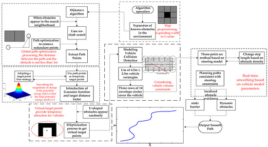Based on the common problems of APF algorithms in the above studies, this article is aimed at (1) Localized oscillatory phenomena due to random generation of U-shaped obstacles; (2) When the target point is reached, the combined potential energy of the potential field is not zero, and the total potential field changes by a large amount; (3) The vehicle obstacle avoidance process produces the phenomenon of path cusps as well as the planned path does not conform to the vehicle steering constraints; (4) No real-time smoothing, not based on real-time dynamic feedback; (5) The volume influence of the algorithm carrier was not taken into account, and other defects to carry out the following work, the flowchart of the fusion algorithm in this paper is shown in Figure 1.