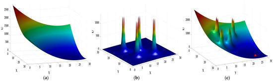The APF algorithm, as a kind of virtual composite force field, superimposes the attractive force from the target point and the repulsive force from the obstacle together to form a resultant force vector, which acts on the vehicle for local obstacle avoidance. The gravitational field, repulsive field, and combined potential field of the APF algorithm are shown in Figure 2.