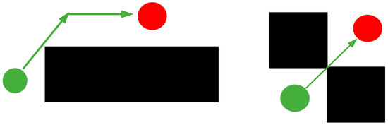 In this paper, the APF algorithm is applied to raster maps, but the traditional raster maps and Dijkstra’s algorithm have the following defects: firstly, although the child node generated by the algorithm is not in the range of the obstacle, the connecting line of the child node and the parent node is easy to be close to the obstacle, and secondly, in the actual path planning, there are some concave obstacles as well as some extremely narrow roads, which cause the algorithm to waste unnecessary resource area to explore these unnecessary grids, as shown in Figure 3.