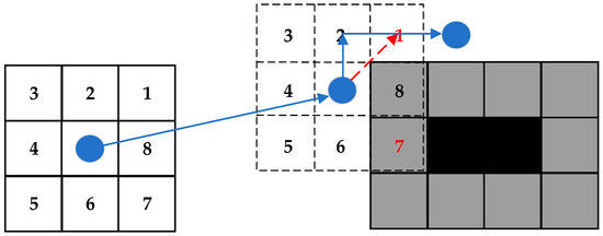 As can be seen in Figure 4, when the pre-processed obstacles appear near the search neighborhood, the optimized Dijkstra’s algorithm filters out the 1 and 7 search neighborhoods to prevent the phenomenon of diagonal penetration of obstacles and selects Neighborhood 2 for planning. At the same time, preprocessing the obstacles can ensure the safety of the path.