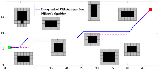 In this paper, the proposed two measures are simulated and verified. Among them, the green grid, red grid, and black grid represent the starting point, arrival point, and obstacles, respectively; the gray grid is the extended grid; and the blue line is the path planned after the Dijkstra algorithm optimizes the search direction, as shown in Figure 5.