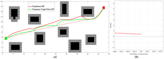 Figure 9. Path and Utotal comparison chart. They are: (a) MATLAB simulation diagram; and (b) Combined potential energy maps using the temporary target point APF.