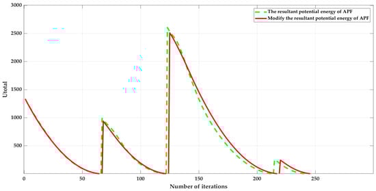 The necessary points of the paths calculated by Formulas (5) and (6) are taken as the temporary target points of the APF algorithm to provide attraction. Use the final target point and the temporary target point, respectively, to exert gravitational force on the current point. Compare the two ways and calculate the combined potential energy. The comparison graph and the combined potential energy graph are shown in Figure 7.