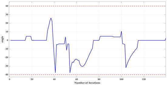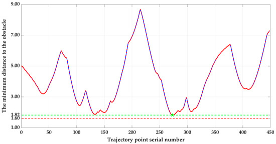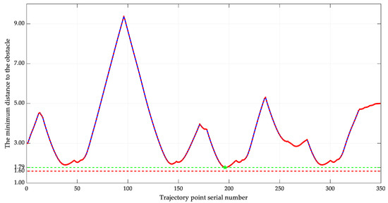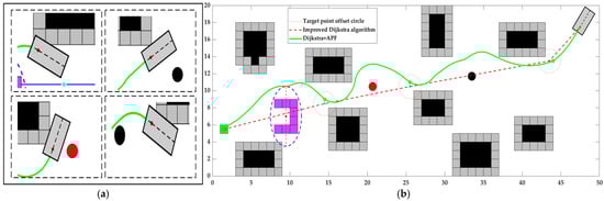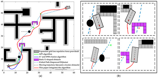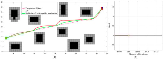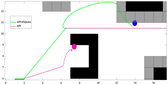 From Figure 5, it can be observed that the optimized raster map and the distance between the path planned by Dijkstra’s algorithm and the obstacles are enlarged by at least one raster width, which improves the quality of the path and provides a good basis for the subsequent APF algorithm.