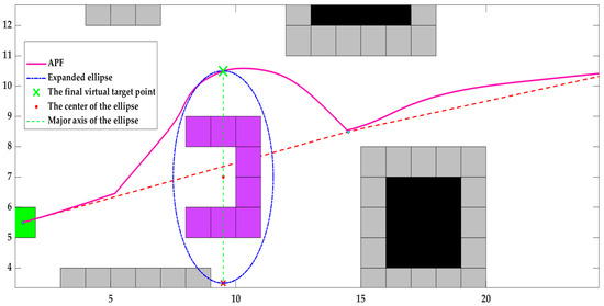 The approach begins by determining the center of the U-shaped obstacle, ( ( u max x + u min x ) 2 , ( u max y + u min y ) 2 ) , as the center of the ellipse and then determines the long and short axes of the ellipse based on the length of the boundary of the U-shaped obstacle plus the width of the vehicle. The long and short axes of the ellipse are determined by adding the width of the vehicle to the length of the boundary of the U-shaped obstacle, which is the “dilated” half-axis of the x- and y-directions, respectively, and taking the width of the vehicle ( w i d t h 2 ) into account. The cos θ is used for reorientation when the obstacle is not directly in the Cartesian coordinate system. Secondly, the two endpoints of the long axis are selected as the temporary virtual target points. At this time, the size of the combined potential energy of the two virtual target points is calculated, and the temporary virtual target point with the smallest combined potential energy is selected as the final virtual target point. According to Equation (3), the virtual target point q goal is used as the attraction for the APF algorithm to provide the improvement of the simulation, as shown in Figure 11.