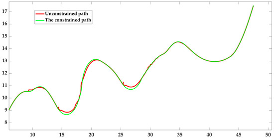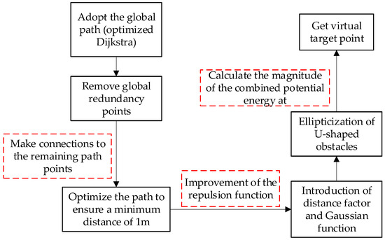 As can be seen from the figure, the U-shaped obstacle is ellipticized, and two temporary virtual target points are found through the elliptic function. Finally, the green point with the lowest potential energy is selected as the final virtual target point to provide attraction. When facing U-shaped obstacles, it can be directly bypassed, avoiding the occurrence of local oscillation phenomena. And based on the improved repulsive force function, the local path can basically fit the path planned by the Dijkstra algorithm. The improvements in Section 2.3 are shown in Figure 12.