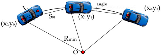 Therefore, according to the above problems, this paper adopts the three-point arc method based on the steering model to make the APF algorithm able to make the path more continuous and smooth when performing local obstacle avoidance and path planning. Since the application carrier of the algorithm is a vehicle model, and the vehicle model has the characteristic of a minimum turning radius, in order to comply with the vehicle kinematics constraints, not only are curvature limitations needed on the planned paths, but also the planned paths cannot be less than the minimum turning radius of the vehicle radius, so it is necessary to add the corner constraints in the algorithm.