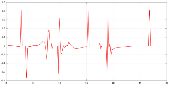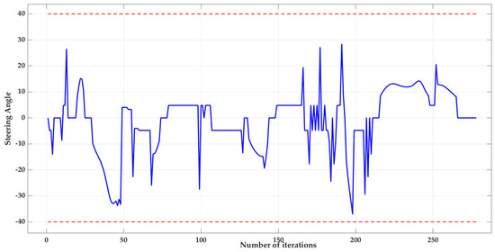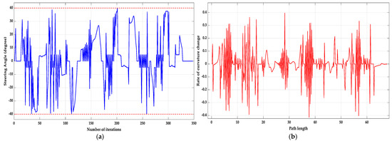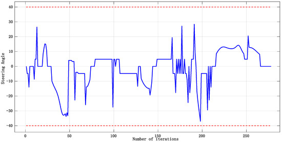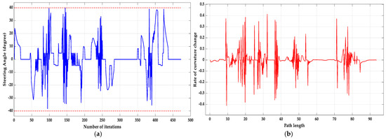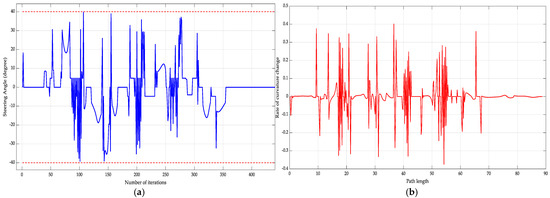 The path planned by the APF algorithm using the theory of the three-point arc method is shown in Figure 13, and the curvature of this smooth path segment is derived and represented in Figure 14.