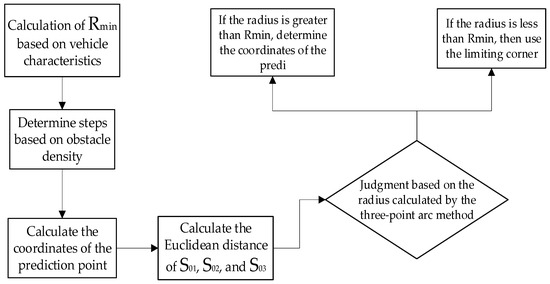 The three-point arc method used in this paper will first determine whether the turning radius meets the requirements. According to the coordinates of the previous point x 0 , y 0 , the current point x 1 , y 1 and the coordinates of the predicted point x 2 , y 2 planned by the APF algorithm to calculate the distance between the three points, the calculation formula is shown in Equation (15).