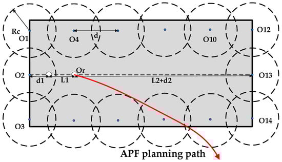 In the traditional APF, the magnitude of the gravitational potential energy at the current point position increases as the distance and position of the target point increase. Similarly, the potential energy of the repulsive force decreases as the distance and position from the obstacle increase. The calculation formulas of the potential field functions for the gravitational potential field and the repulsive potential field are shown in Equations (1) and (2) as follows [20]: