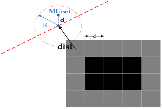 The relative position of the center point in this line segment is represented by the projection scale t while restricting it to the range (0,1), and then the distance dist is calculated by Equation (6).
