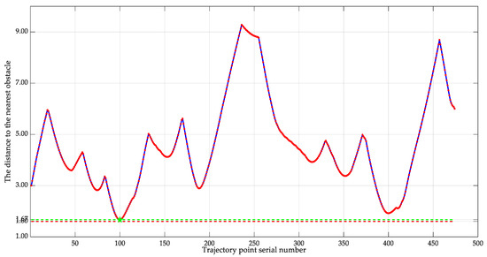 In this paper, the obstacle grid is inflated with a width of 1 m. This inflation threshold is for the safety margin provided by the global planning algorithm (Dijkstra). At the same time, if a larger distance expansion is chosen, it will result in a situation where the passable area is too small, which is additionally burdensome. In practice, the expansion threshold is not necessarily fixed and can be adjusted according to the situation.