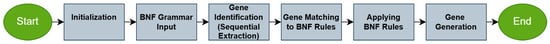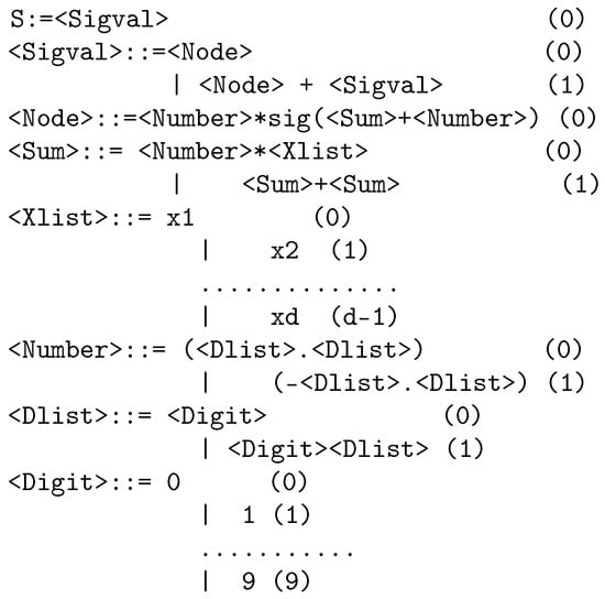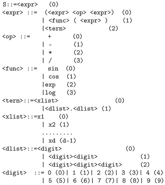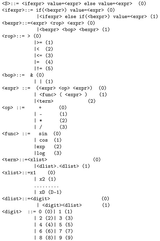 The Grammatical Evolution procedure is considered as a variant of genetic algorithms [,], where the chromosomes are series of integer values that represent production rules of the underlying BNF grammar. BNF grammars are denoted as sets , with the following definitions: