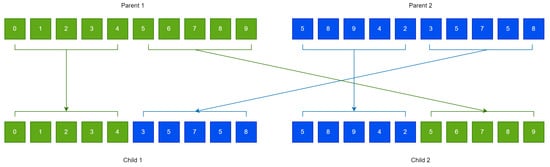 - Create chromosomes with the assistance of the one-point crossover shown graphically in Figure 4. For every couple of created offsprings, two chromosomes should be chosen from the current population using tournament selection.