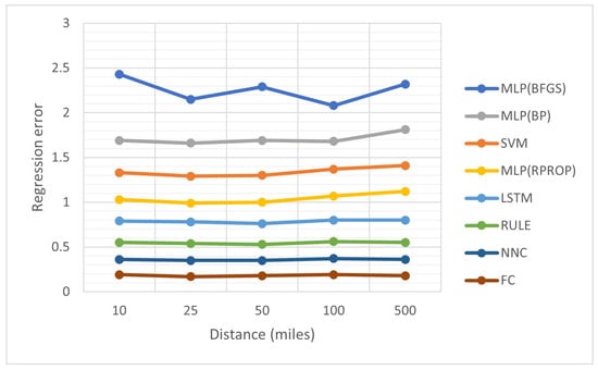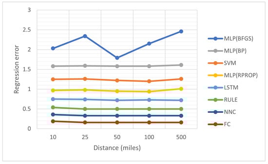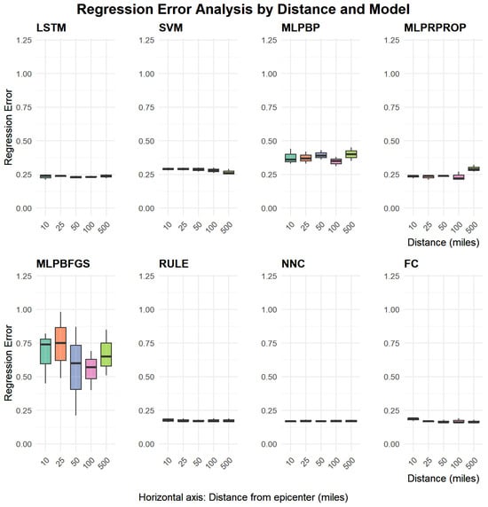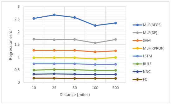 In Figure 12 and Figure 13, the prediction error analysis results for different machine learning models are presented. We observe significant differences between the two model categories. The analysis reveals that models without Grammatical Evolution exhibit greater variability in prediction errors. Notably, one of these models shows particularly high errors at certain distances, indicating a lack of stability. In contrast, the most effective model in this category maintains relatively low errors across all distances. The methods with Grammatical Evolution demonstrate remarkable stability and lower errors. The three models in this category show similar and consistent performance, with minimal variations across different distances and years. The effect of distance is clearly visible in models without Grammatical Evolution, where errors vary significantly. Conversely, in models with Grammatical Evolution, distance does not appear to significantly affect prediction accuracy. Temporally, while models without Grammatical Evolution show some improvement over time, models with Grammatical Evolution maintain stable performance throughout the study period. Overall, the results support the superiority of methods with Grammatical Evolution, which demonstrate greater reliability and stability under various conditions. This ability to effectively handle data variations makes them an ideal choice for applications requiring accurate and stable predictions.