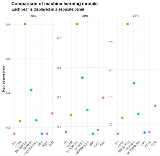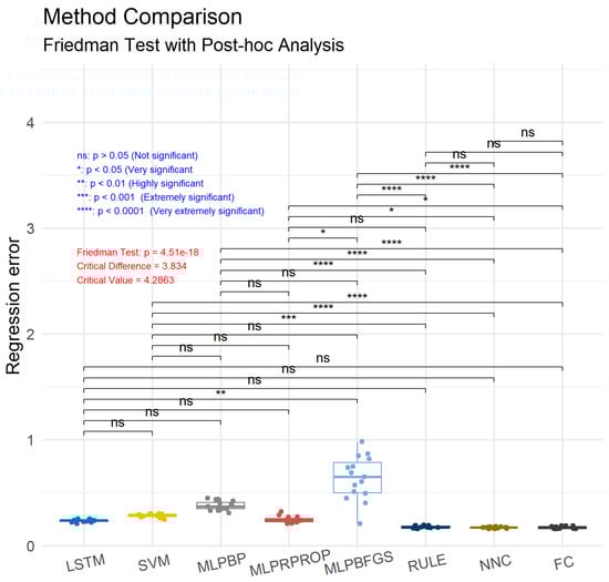 According to the results of the Friedman test shown in Figure 11, where the overall difference between the models is extremely statistically significant (p = 4.51 × 10−18 < 0.0001, critical value = 4.2863,critical difference = 3.834), the following key stratifications are observed: The models with Grammatical Evolution (RULE, NNC, FC) show homogeneous performance (p = ns among them), but are significantly better (p = ****) than MLP(BP) and MLP(BFGS). They also significantly outperform SVM (p = **** for NNC/FC, p = *** for RULE). LSTM (without Grammar-Based Evolution) does not differ significantly either from the models with Grammar-Based Evolution (p = ns) or from SVM, MLP(BP), and MLP(RPROP) (p = ns), with the only significant difference being against MLP(BFGS) (p = **). MLP(RPROP) (without Grammar-Based Evolution) does not differ from RULE (p = ns), but shows significantly higher error than NNC/FC (p = *) and MLP(BFGS) (p = *). MLP(BFGS) (without Grammar-Based Evolution) is the least reliable model, with significantly worse performance (p = ***) compared to all models with Grammar-Based Evolution, and significantly worse performance than LSTM (p = **) and MLP(RPROP) (p = *).