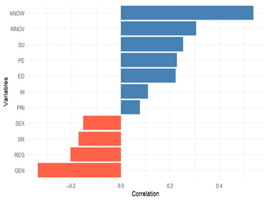 For multi-item variables (PE, INNOV, PRI, SU, SR, and REG), the standardized value of the first principal component, extracted using varimax rotation, was employed. This extraction was justified if factor loadings exceeded 0.6, the average variance extracted was at least 50%, and the null hypothesis of the correlation matrix’s sphericity was rejected using Bartlett’s test.