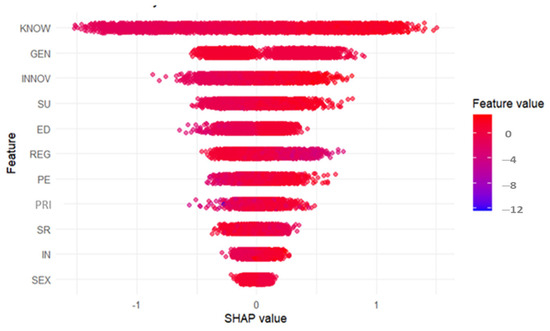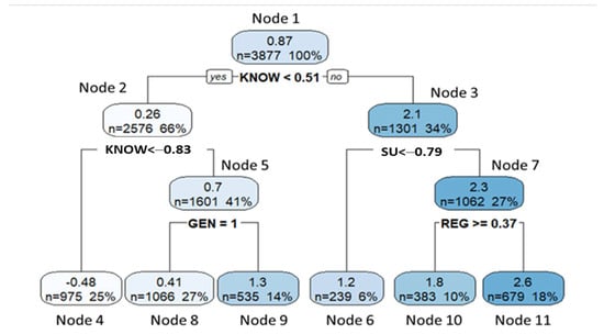 Subsequently, to address RO1, we fit a DTR and its generalizations, RF and XGBoost, using the full sample. Model fit was assessed using the coefficient of determination (R2), root mean squared error (RMSE), and mean absolute error (MAE). Although RF [24] and XGBoost [25] are expected to yield substantially higher R2 values, DTR provides a clear visual representation of how threshold values for explanatory variables direct observations toward lower-level nodes. For instance, if a node splits under the condition X < Xa, leading to nodes associated with lower usage, the relationship between USE and X is interpreted as increasing. Conversely, if the condition is X > Xa, USE is considered to decrease with X. Surrogate splits will also be of interest, as they help infer the sign of the relationship for explanatory variables that are not primary split criteria, but may act as substitutes. In this step, we also conducted a preliminary analysis of the predictive performance of the machine learning methods and linear regression using a holdout validation test. Evaluating predictive power is essential for theory development and validation as well as for selecting models to support decision-making in management and policy [76]. The evaluation was based on three performance metrics: Stone–Geisser’s Q2, root mean squared error (RMSE), and mean absolute error (MAE), and randomly splitting the sample into 80% training and 20% testing sets. This approach provides an initial comparison of the out-of-sample predictive capabilities of each method.