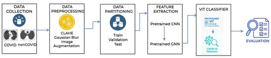 In summary, the ViTGNN Algorithm 1 integrates CNN-GNN-based feature extraction with a ViT-based classifier, providing an effective approach for COVID-19 detection in CT scans. Image preprocessing involves CLAHE and Gaussian blur, followed by resizing and normalization. The dataset is divided into training, validation, and test sets, with a custom transformation pipeline. Initially, a CNN is used to extract low-level visual features, which are then passed to a GNN for spatial relationship modeling. Subsequently, these features are fused into a ViT for classification. The model is trained using cross-entropy loss, the Adam optimizer, and early stopping. After training, it is evaluated on test data using accuracy, precision, recall, F1-score, and AUC. This hybrid model captures detailed local features and broader image context, enhancing both accuracy and interpretability compared to traditional models.