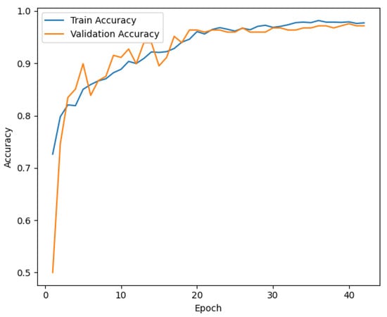 Interestingly, other baseline models such as MS-NET and the redesigned Single COVID-NET also perform well, with MS-NET achieving an accuracy of 87.98% and the redesigned Single COVID-NET achieving 89.09%. However, these models show limitations in precision and recall, indicating challenges in balancing the trade-offs between false positives and false negatives. In addition, joint models consistently underperform compared to their single counterparts, suggesting potential overfitting or noise amplification when combining features. Similarly, the Series Adapter outperforms the Parallel Adapter, which indicates structural differences in how the adapters handle feature hierarchies. The loss curve for training and validation, illustrated in Figure 3, further supports the effectiveness of the ViTGNN training process. The steady decline in training loss, accompanied by a consistent reduction in validation loss, indicates that the model effectively generalizes without overfitting. Furthermore, the training and validation accuracy curve in Figure 4 shows a convergence towards high accuracy, with a minimal divergence between training and validation accuracy, highlighting the robustness of the model during training.