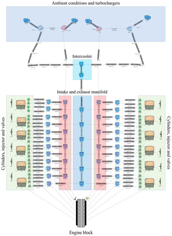 Firstly, the dual-fuel engine model is constructed in WAVE using the various elements available in the software, which combines flow, mechanical, and control components, as shown in Figure 2. The engine model features two turbochargers, one intercooler, twelve cylinders, and intake and exhaust manifolds. Similar to modern diesel engines, each cylinder is equipped with four valves—two for intake, two for exhaust—along with one injector in the liquid fuel mode, as the main focus of this study. The dimension of each part is collected from the project guide of the manufacturer [55,56].