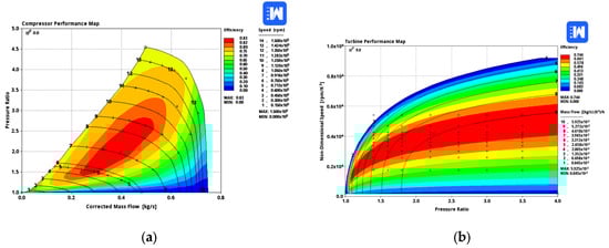 The compressor and turbine maps for each turbocharger, as shown in Figure 3, are defined and rescaled from existing maps provided by the software to fit the engine’s needs for airflow at a given pressure.