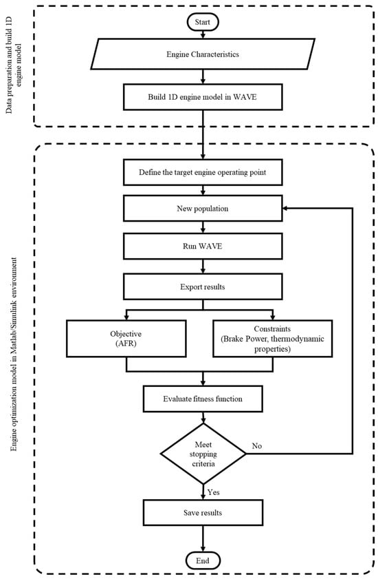 The optimization model developed in this study integrates WAVE 2024.1 from Realis Simulation [53], as a 1D engine simulation software, with a nonlinear optimizer in Matlab, as shown in Figure 1. The results from the optimization model are subsequently imported into an Excel tool developed by Realis Simulation, which uses the Chen–Flynn model to fit the optimized data and determine the optimal coefficients for the friction equation.