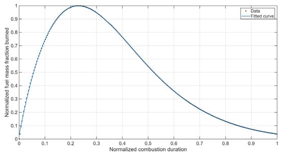 The square of the coefficient of determination (R2) is used to evaluate the fuel burn rate along with the combustion duration compared to a polynomial equation from the sixth degree to ensure the smoothness of the curve and, thus, the combustion behavior, avoiding any misfire and unstable combustion. The degree of polynomial equations is selected based on several trials to ensure the best fitting. Due to the different values in the amount of fuel burn rate and the combustion duration, a normalized curve is presented, as shown in Figure 5. The fuel burn rate curve is rescaled from 0 to 1 to make it easier to identify, and the fitting procedures are performed.