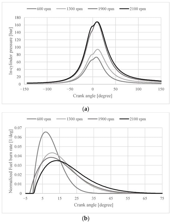 (a) In-cylinder pressure diagram and (b) fuel burn rate for four different engine operating points.