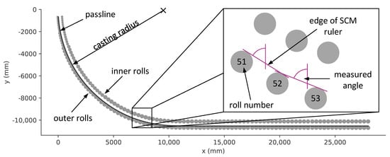 Rollplan side view [18] and angle measurement principle. For clarity, the SCM itself is not shown. The “passline” is an imaginary line, which represents the contour of the strand backside under ideal alignment conditions. This line passes through the contact points between the outer rolls and the strands outer surface.