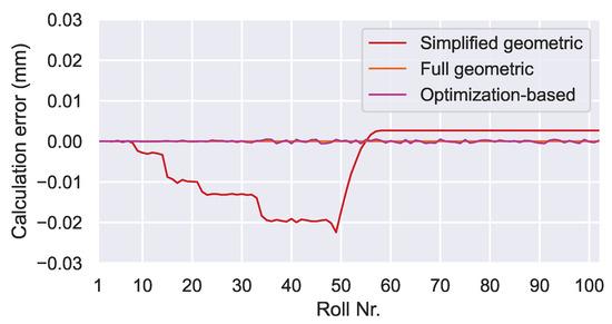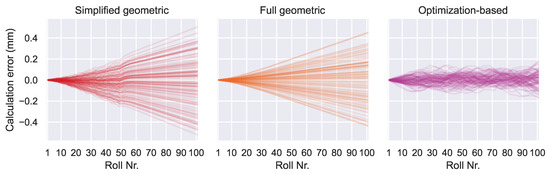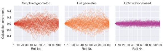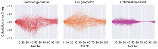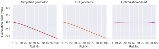 Calculation error accumulation is indicated by a calculation error that rises nearly linearly over the length of the machine. The results from the geometric algorithms show this behavior in Figure 12. A constant measurement error in combination with the chain-like structure of the geometric algorithms are responsible here. At each step in the calculation chain, the constant component of the angle measurement error contributes to an error in the position calculation for the next roll. With each roll in the calculation chain, this error accumulates continuously, leading to the observed behavior. The optimization-based algorithm is much less affected because the third term in the loss function helps to keep the predicted positions errors small. This effect was also mentioned in [22,25].