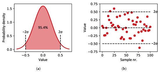 (a) Normal distribution with an amplitude (two times standard deviation) of 0.5. A total of 95.4% of sampled values will fall within this amplitude. (b) Example of 100 values sampled from that distribution.