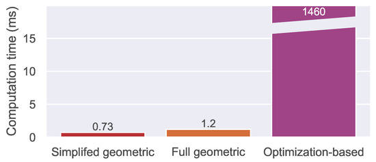 Before the best algorithm can be determined, the computational cost must be evaluated. The average runtimes of each algorithm were measured and are shown in Figure 19. Since both geometric approaches share the same general approach, they result in a similar runtime. While the simplified approach needs a bit less than a millisecond, the full geometric algorithm takes a bit longer than a millisecond. Due to the iterative nature of the optimization-based algorithm, where all calculations are performed about 2000 times, the runtime is about 1000 times longer ( s). In the context of the application, this computation time is perfectly acceptable and it is vastly outweighed by the algorithm’s performance.